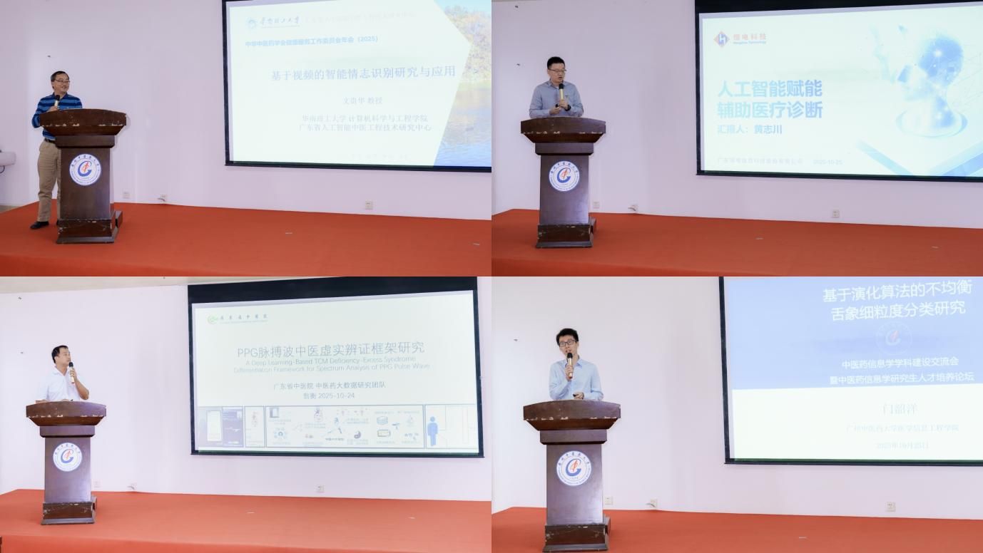 在学科学术讲座交流环节,华南理工大学计算机科学与工程公司文贵华教授带来《基于中医情志理论的心理健康评估思考》,从跨学科视角探索中医情志理论与心理健康评估的结合点;广东省中医院大数据研究中心翁衡教授分享《PPG 脉搏波中医虚实辨证框架研究》,展示了脉搏波技术在中医辨证中的创新应用;广东恒电信息科技股份有限公司黄志川博士作《人工智能赋能辅助医疗诊断》报告,呈现人工智能在医疗诊断领域的实践成果;英国be365官网门韶洋副教授阐述《基于演化算法的不均衡舌像疾病分类研究》,为中医舌诊智能化提供新的技术思路。